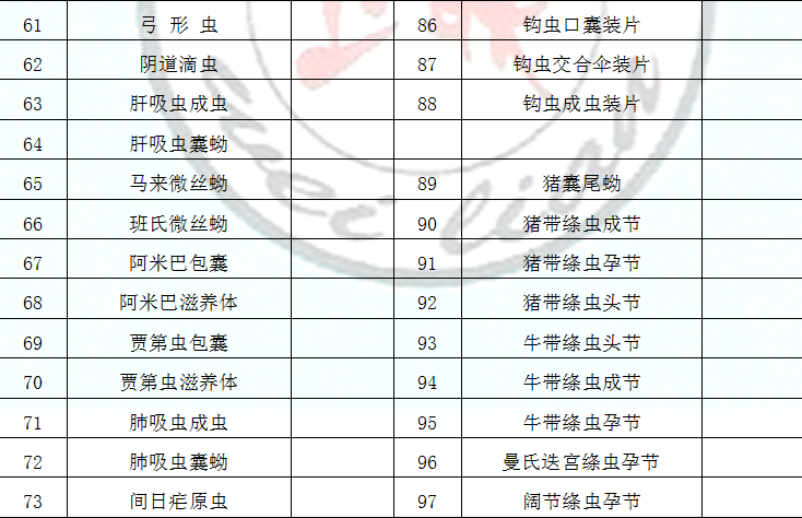 51 血吸蟲毛蚴 75 卡氏肺包囊蟲